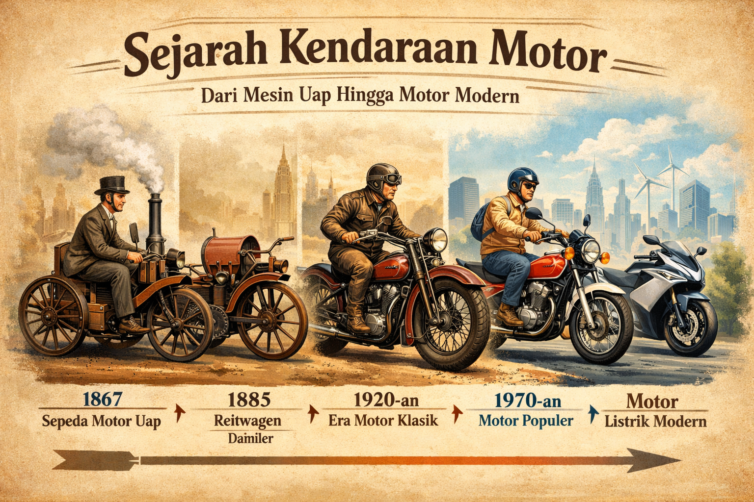 Sejarah sepeda motor adalah cerminan dari kemajuan teknologi dan kebutuhan manusia akan mobilitas. Dari mesin uap sederhana hingga motor listrik canggih, sepeda motor terus berevolusi dan memainkan peran penting dalam kehidupan modern. (*)